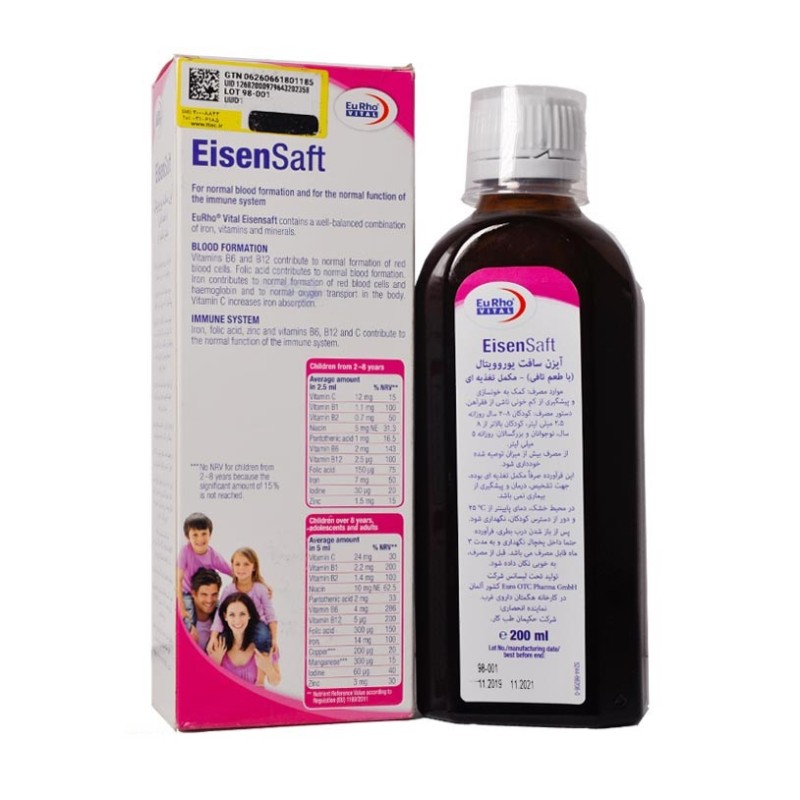 شربت آیزن سافت یورو ویتال با توجه به ویتامینهای مختلف و املاح معدنی که دارد، یک مکمل غذایی مناسب برای تمام سنین 2 سال به بالا می باشد. این مکمل در پیشگیری از کم خونی و خونسازی بدن بسیار موثر میباشد و از بروز کمخونی ناشی از فقر آهن پیشگیری مینماید.