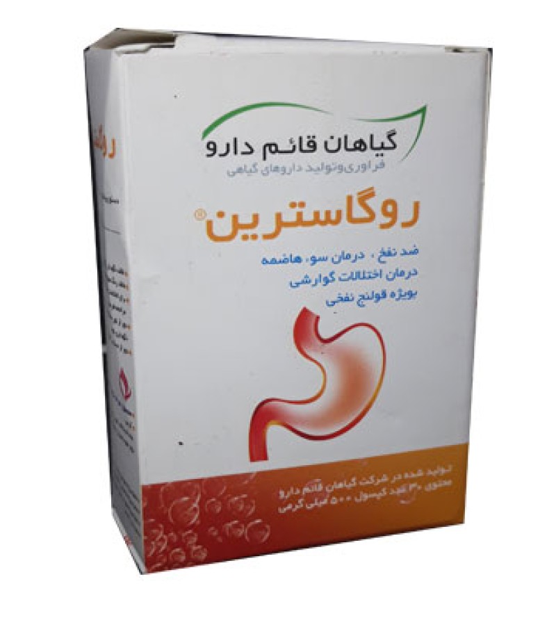 کپسول روگاسترین قائم دارو از پودر میوه گیاه کاریوم کاروی تهیه شده که خواص ضد اسپاسم، ضد نفخ و ضد میکروب دارد و برای درمان اختلالات گوارشی به ویژه قولنج نفخی بسیار موثر است.