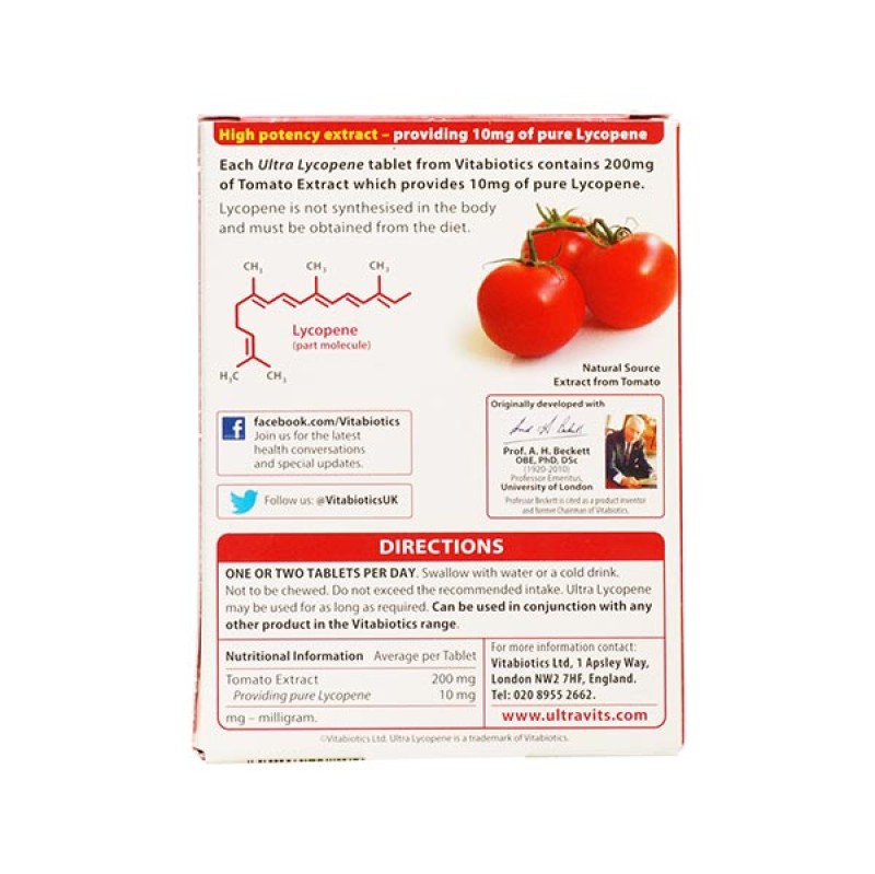 قرص اولترا لیکوپن ویتابیوتیکس حاوی ۲۰۰ میلی گرم عصاره گوجه فرنگی که تامین کننده ۱۰ میلی گرم لیکوپن خالص است.
